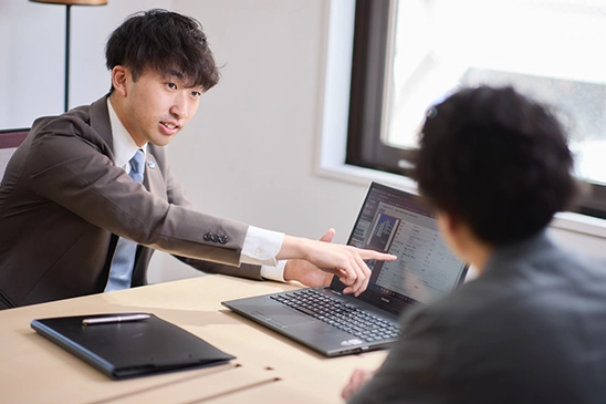 不動産はむずかしい業界と思っている方が多いかもしれません。でも、未経験で資格がなくても、やる気や目標があればできる仕事です。サンコーポレーションでは不動産の幅広い知識が必要ですが、逆に言うと領域が広い分、仕事を覚えるスピードも早くなります。